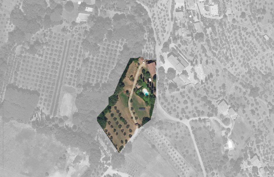 The farmhouse is surrounded by approximately one hectare of private land with olive trees, cypresses, and a well-kept garden, alternating open spaces with more intimate corners designed for relaxation. A large covered patio invites outdoor living year-round, while the 4×8-meter swimming pool, beautifully integrated into the landscape and sheltered by mature trees, offers a private area with a solarium and a dedicated utility room. The property also includes additional outbuildings for utilities and services, private covered and uncovered parking, solar panels and air conditioning on the upper floors, as well as recently updated plumbing and electrical systems.