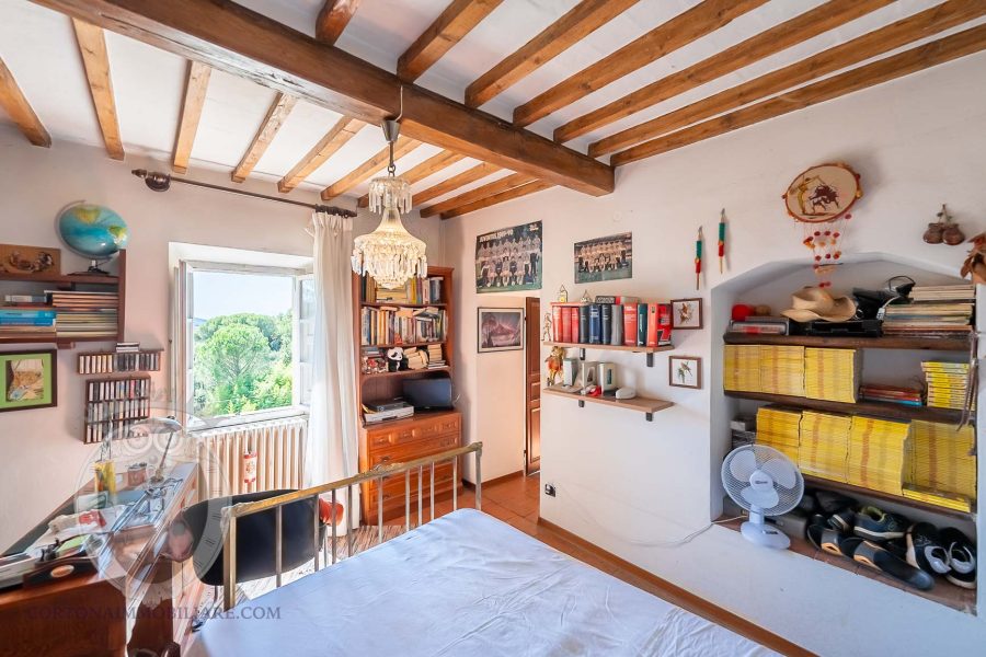 The outdoor area extends over a plot of land of about 3 hectares, crossed by a picturesque stream and divided between woods and garden. Here there are various annexes, including a cellar of about 43 square meters, a wood-burning oven of 28 square meters, a barn of 43 square meters, an 8 square meter cistern and storage rooms for 8 square meters.