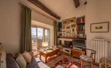 Gli ambienti conservano il fascino tipico delle case cortonesi: travi in legno a vista, soffitti con decori pittorici, pavimenti in cotto e scorci suggestivi sulle antiche mura e i tetti del borgo. Le finestre, alcune con piccolo affaccio panoramico, incorniciano scorci autentici del centro storico, donando luminosità e carattere a ogni piano.